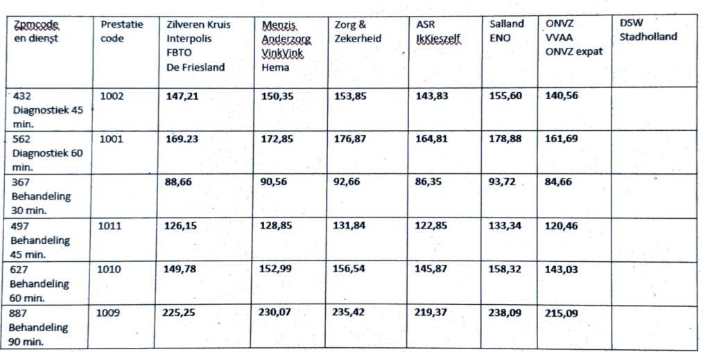 De tarieven zijn door het NZA gemaximeerd, zie https://zorgprestatiemodel.nza.nl/ en het tarief dat door de praktijk in rekening gebracht wordt is een percentage van dit maximale bedrag afhankelijk van welke zorgverzekeraar u heeft. De tariefbedragen zijn voorts afhankelijk van de duur van het consult (45 min of 60 min) en of het een behandelconsult of een diagnostiek consult betreft. Op de factuur die u krijgt van de verzekeraar zal dit allemaal gespecificeerd en inzichtelijk gemaakt zijn.